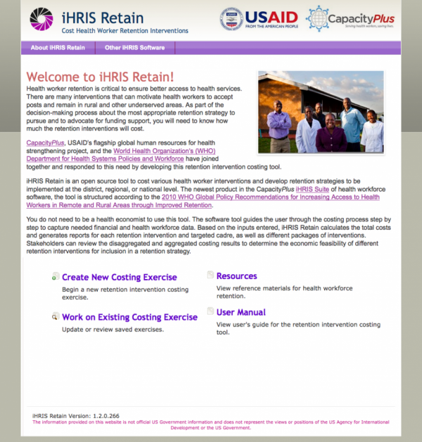 iHRIS Retain is a web-based tool for costing health worker retention strategies. Workforce planners and policy makers, health facility administrators, and human resources managers can use iHRIS Retain to plan retention interventions at the district, regional, and national levels. It may be used alone or as part of the full iHRIS platform of health workforce information tools and technologies.